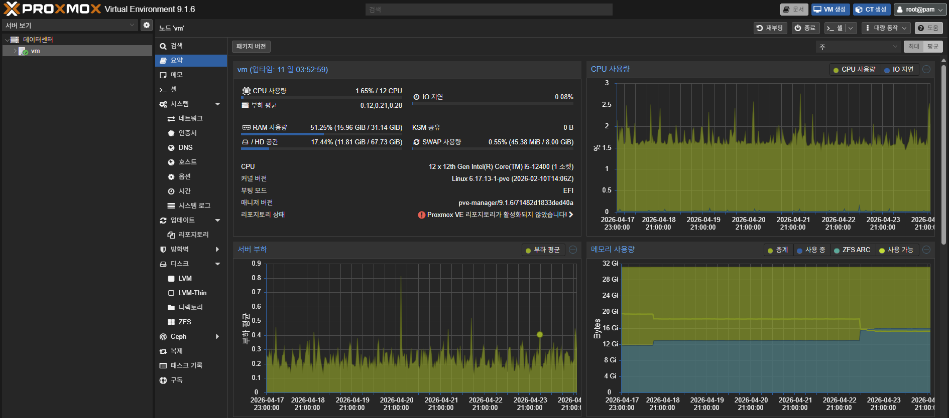 CPU 사용량은 평균 1.6%. 한없이 아이들에 가까운 수준입니다. 때문에 아이들 전력소모를 제일 중요하게 여겼고, 이를 중점으로 구축이 완료되어서 이제 잘 유지만 하면 되겠습니다.